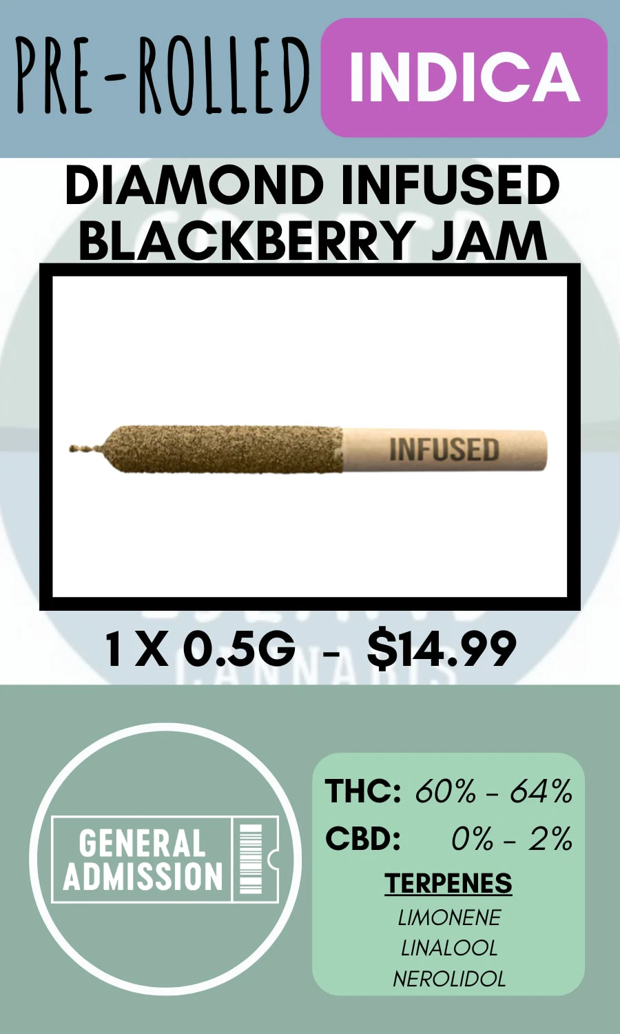 Rise and shine! Blackberry Jam Ultra-Infused serves up tart raspberry and sweet blackberry infused with diamonds! It's a wake-up call for your taste buds. Don't press snooze. G.A. Ultra-Infused Pre-Rolls are made using milled whole flower, dusted in premium kief, boosted with botanical terpenes, and infused with diamonds to deliver their most potent pre-roll yet.
