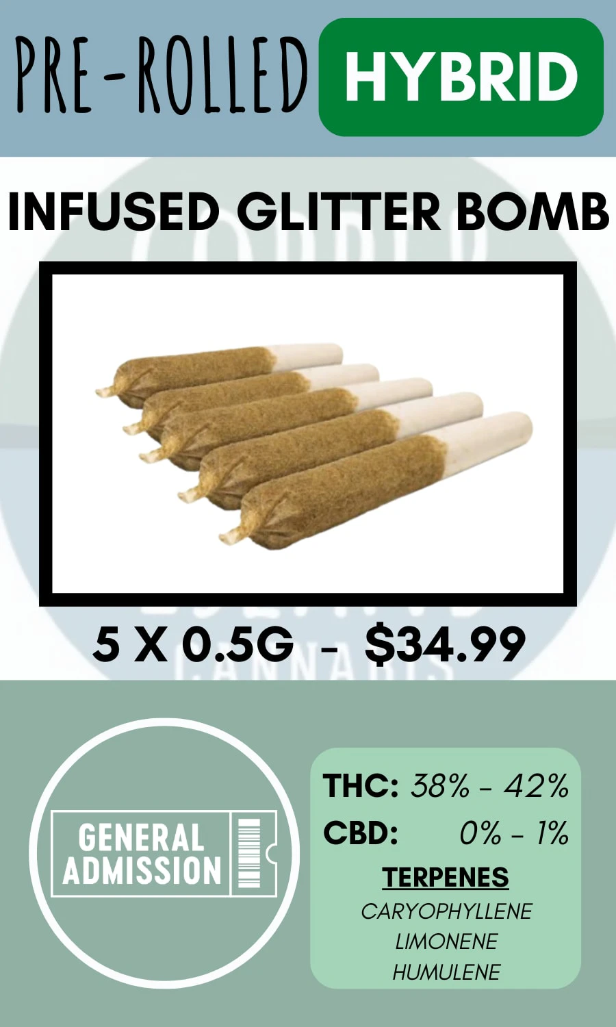 Like glitter, these infused pre-rolls are going to stick to you! Glitter Bomb Infused Pre-Rolls brings shining flavours of peach and raspberry. Made with milled whole flower, infused with their signature triple-distilled distillate, dusted in premium kief, and boosted with botanical terpenes – these infused pre-rolls deliver smooth hits, high THC potency, and the BIG, BOLD flavour you expect from GA!