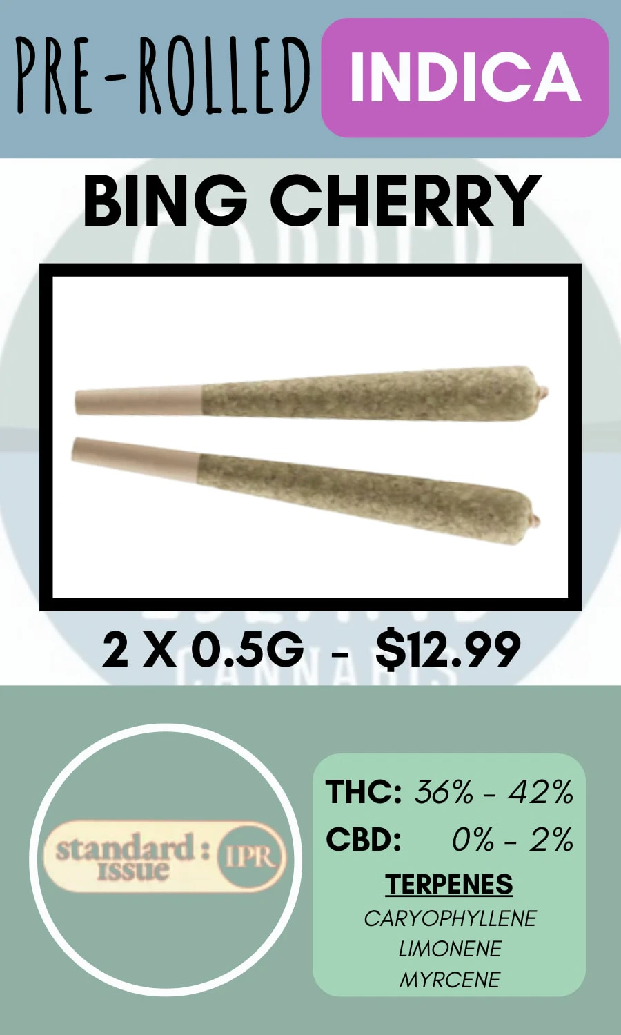 Wild. Tart. Classic Cherry. Bing Cherry brings sweet fruit, hints of floral and that essential tangy finish. Ripe for the picking in a potent and all-around flavourful pack of infused pre-rolls. Cannabis ready to consume, whenever you need it. That's Standard Issue. Stripped of excess, honed to essentials, and designed to keep pace — not for show, but for real life. Consistent, dependable, and ready when you are. Standard Issue: everything you need, nothing you don't. Standard Issue pre-rolls are made from milled whole flower, infused with distillate and botanical terpenes.