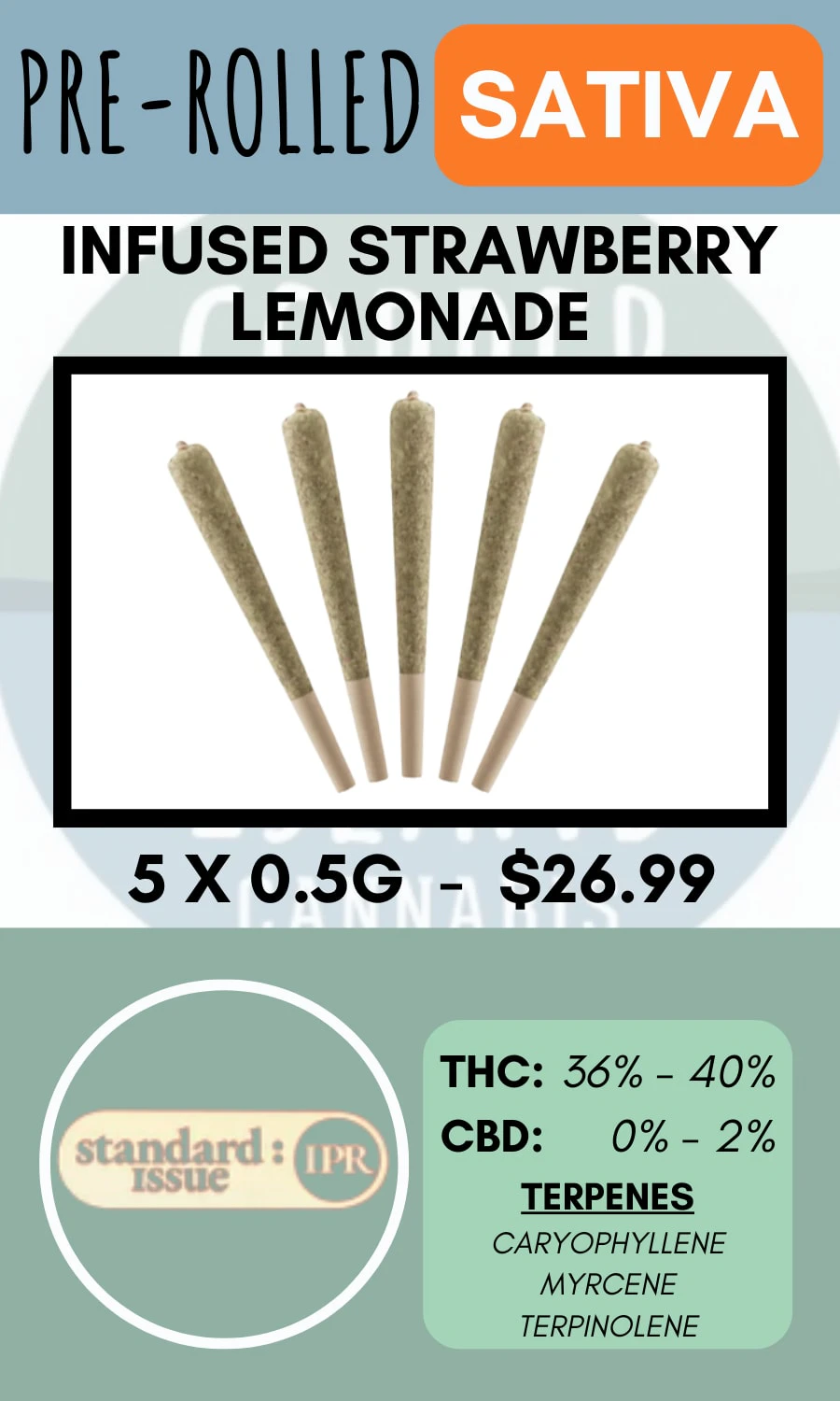 Sweet. Tangy. No-nonsense. Strawberry Lemonade blends ripe strawberries and tart lemon in a potent and all-around flavourful pack of infused pre-rolls. It's a refreshing hit that delivers every time. Cannabis ready to consume — whenever you need it. That's Standard Issue. Stripped of excess, honed to essentials, and designed to keep pace — not for show, but for real life. Consistent, dependable, and ready when you are. Standard Issue: everything you need, nothing you don't. Standard Issue pre-rolls are made from milled whole flower, infused with distillate and botanical terpenes.