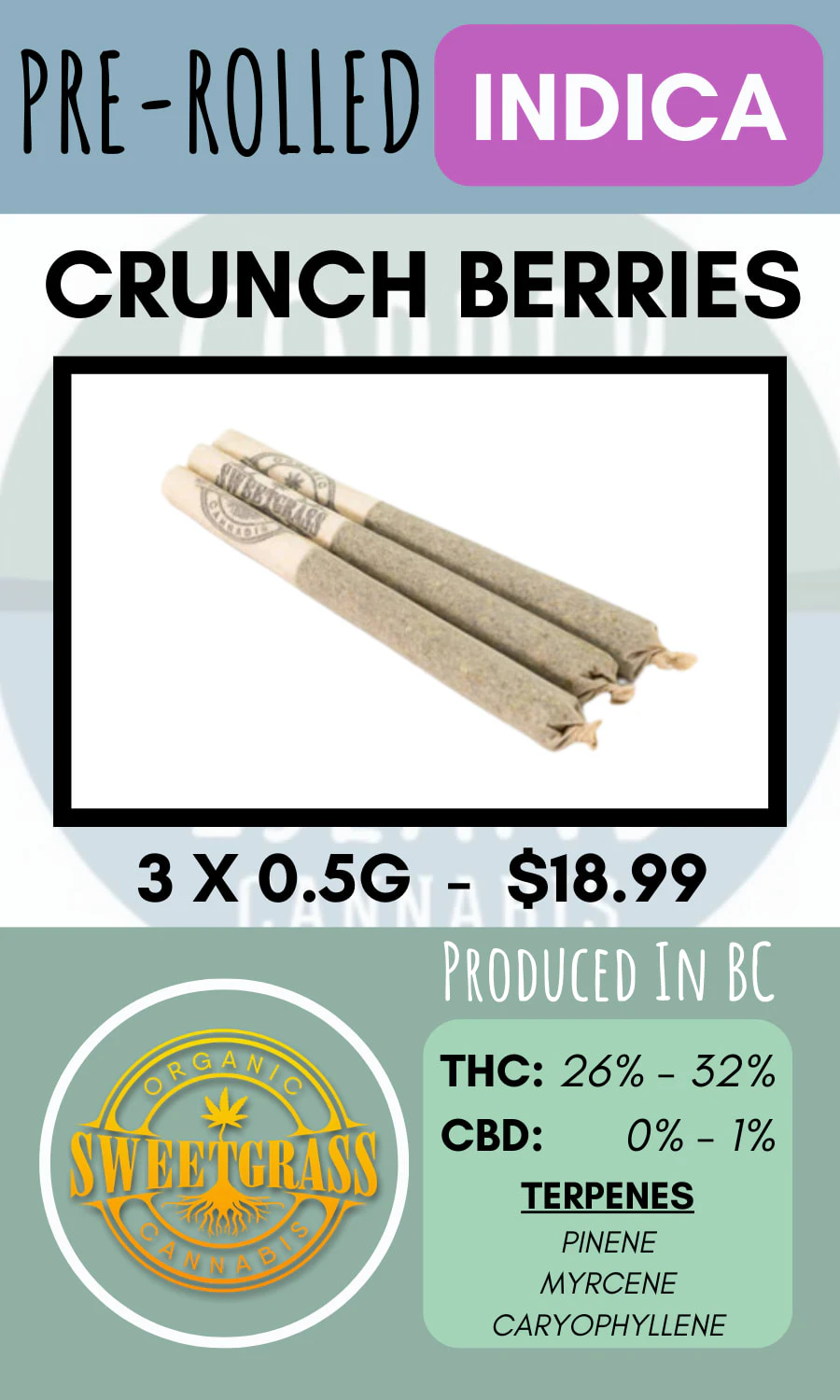 Crunch Berries is an FVOPA certified organic indica dominant hybrid of Blueberry x Triple OG, with very strong THC potency potential. It has an incredible aroma owing to its high (>5%) terpene content, starting with a distinct sweet berry aroma that also contains touches of vanilla, fresh hazlenuts and pine. It has a fruity bouquet flavor that leaves a pleasant after-taste. Sweetgrass Organic Cannabis' Crunch Berries is grown with love indoors in living soil in the heart of the West Kootenays.