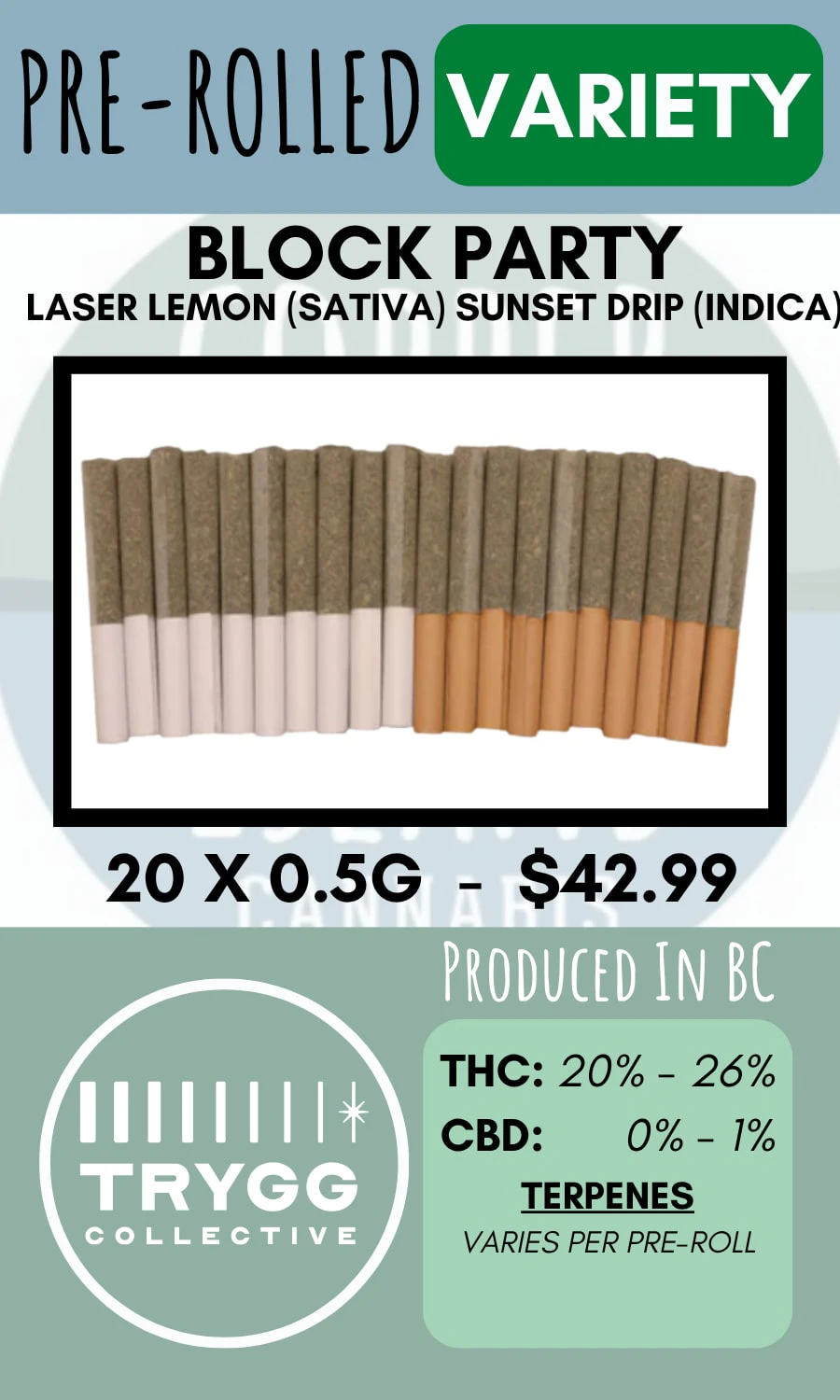 Experience the joy of rotation with TRYGG's Block Party Variety Pack! This 20-pack of half-gram of hybrid pre-rolls is a variety pack filled with premium cannabis cultivars. Each pack will contain 10 pre-rolls of one cultivar, and another 10 pre-rolls of a different cultivar, giving you two amazing cultivars to experience.