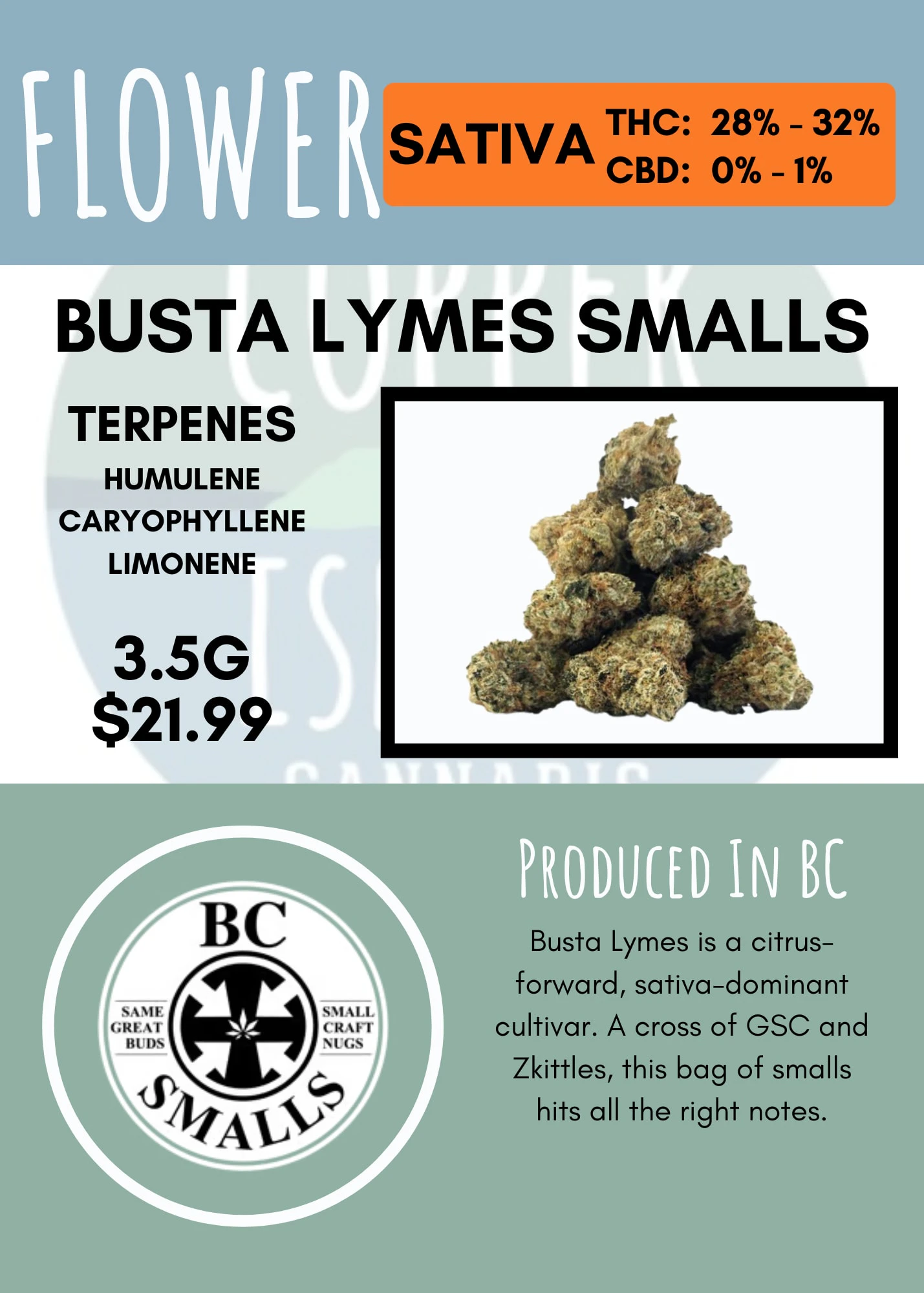 Busta Lymes is a citrus-forward, sativa-dominant cultivar. A cross of GSC and Zkittles, this bag of smalls hits all the right notes, with dominant terpenes of Humulene, Limonene, and Caryophyllene.