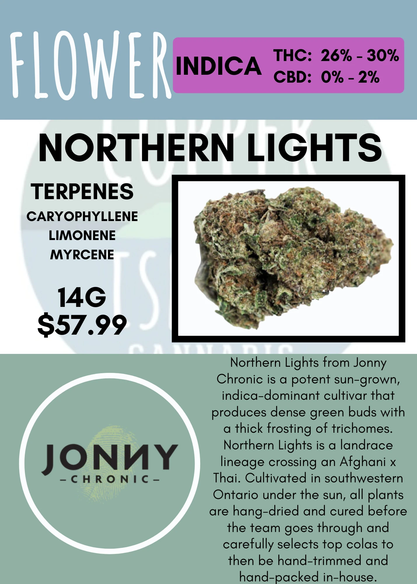 Northern Lights from Jonny Chronic is a potent sun-grown, indica-dominant cultivar that produces dense green buds with a thick frosting of trichomes. Northern Lights is a landrace lineage crossing an Afghani x Thai cultivar, with caryophyllene, limonene, myrcene, and bisabolol terpenes. Cultivated in southwestern Ontario under the sun, all plants are hang-dried and cured before the team goes through and carefully selects top colas to then be hand-trimmed and hand-packed in-house.