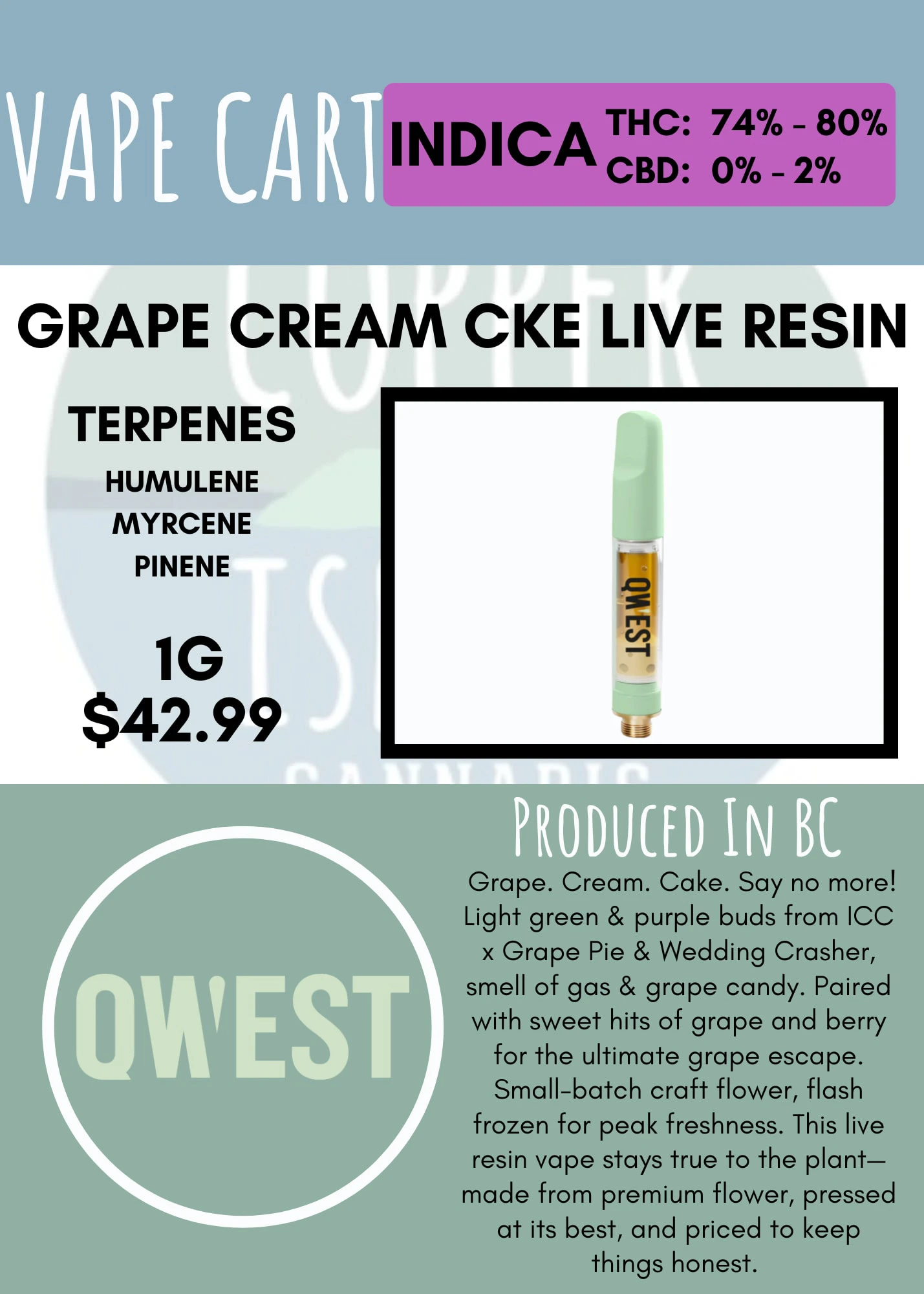 Grape. Cream. Cake. Say no more! Light green & purple buds from ICC x Grape Pie & Wedding Crasher, smell of gas & grape candy. Paired with sweet hits of grape and berry for the ultimate grape escape. Small-batch craft flower, flash frozen for peak freshness. This live resin vape stays true to the plant—made from premium flower, pressed at its best, and priced to keep things honest. The truth is in the cart.