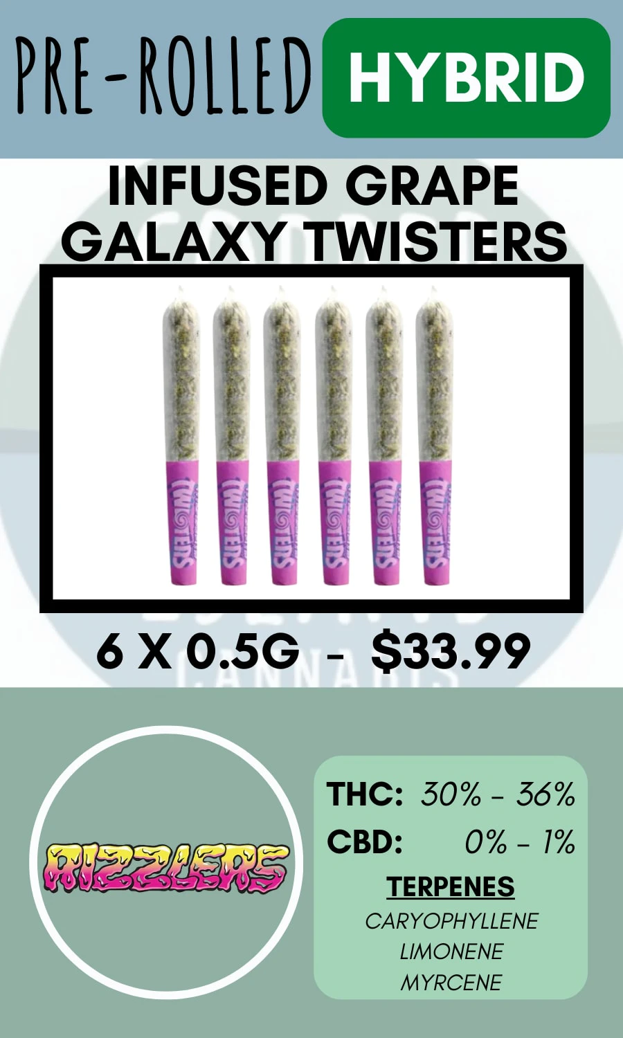 Grab your faves with the Grape Galaxy Twisters Infused Pre-roll Pack — an intergalactic wave of smooth, nostalgic grape flavour. Rolled to perfection and infused with high-quality distillate and mind-blowing flavour from botanical terpenes.