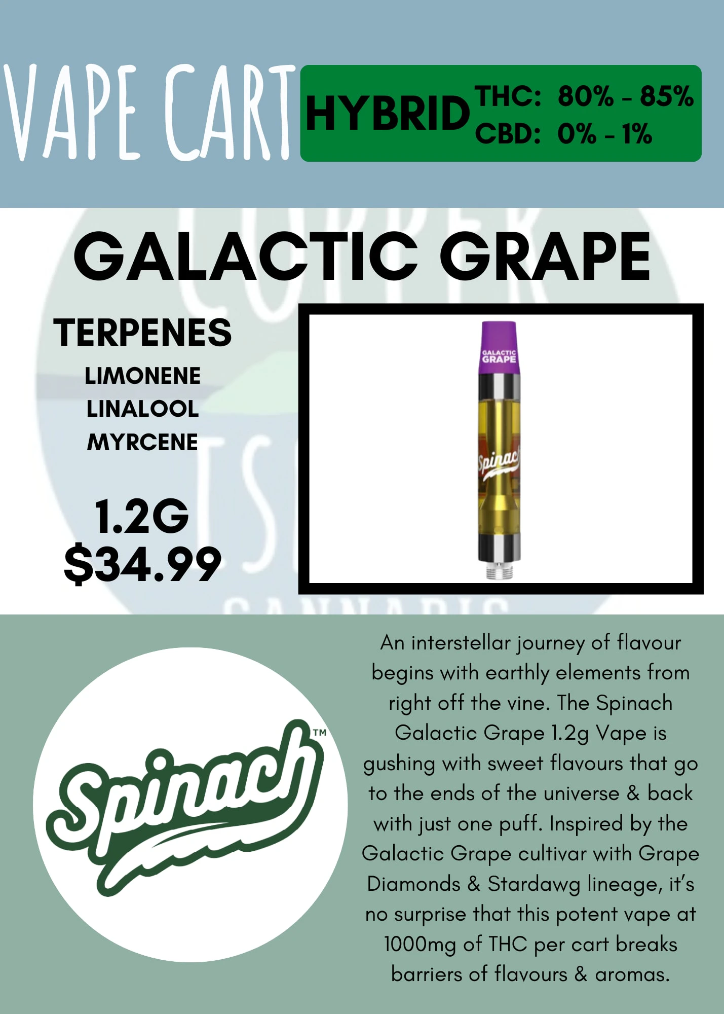 An interstellar journey of flavour begins with earthly elements from right off the vine. The Spinach Galactic Grape 1.2g Vape is gushing with sweet flavours that go to the ends of the universe and back with just one puff. Inspired by the Galactic Grape cultivar with Grape Diamonds and Stardawg lineage, it's no surprise that this potent vape at 1000mg of THC per cart breaks barriers of flavours and aromas. Their rich CO2 extract is cold-filtered at sub-zero temps before it is distilled 4x to ensure consistency and to deliver consistent quality, time and time again.This vape has been formulated with distillate and all natural botanical terpene.