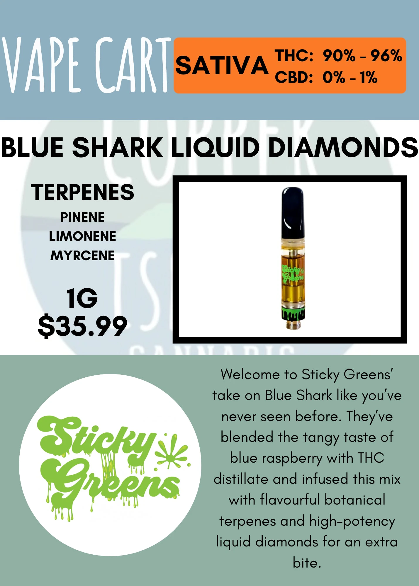 Welcome to Sticky GreensÕ take on Blue Shark like youÕve never seen before. TheyÕve blended the tangy taste of blue raspberry with THC distillate and infused this mix with flavourful botanical terpenes and high-potency liquid diamonds for an extra bite.